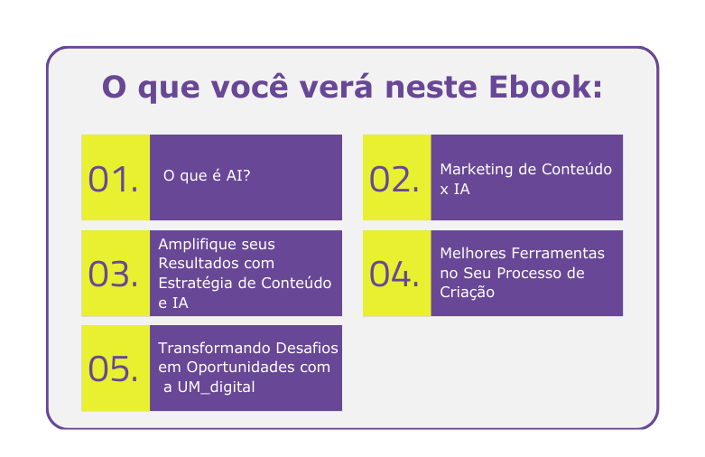 Em nosso eBook, também compartilhamos uma lista de ferramentas baseadas em IA, que já utilizamos e que já foi validado por nossa equipe, e que você pode implementar hoje para começar a colher os benefícios dessa tecnologia revolucionária. Se você busca levar suas estratégias de marketing para o próximo nível, este eBook é para você.